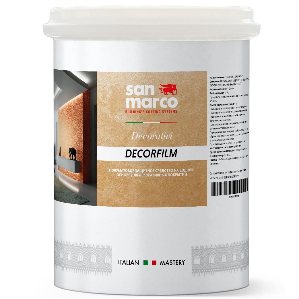 DECORFILM - защитное средство для внутренних и наружных работ для защиты поверхностей, окрашенных декоративной краской, водоэмульсионной краской, эмалью. Акрил-полиуретановые смолы создают защитную пленку, обеспечивая покрытию устойчивость к механическим воздействиям. DECORFILM имеет высокие адгезивные свойства и хорошо растягивается, приглушает поверхностные царапины, быстро высыхает и не желтеет.